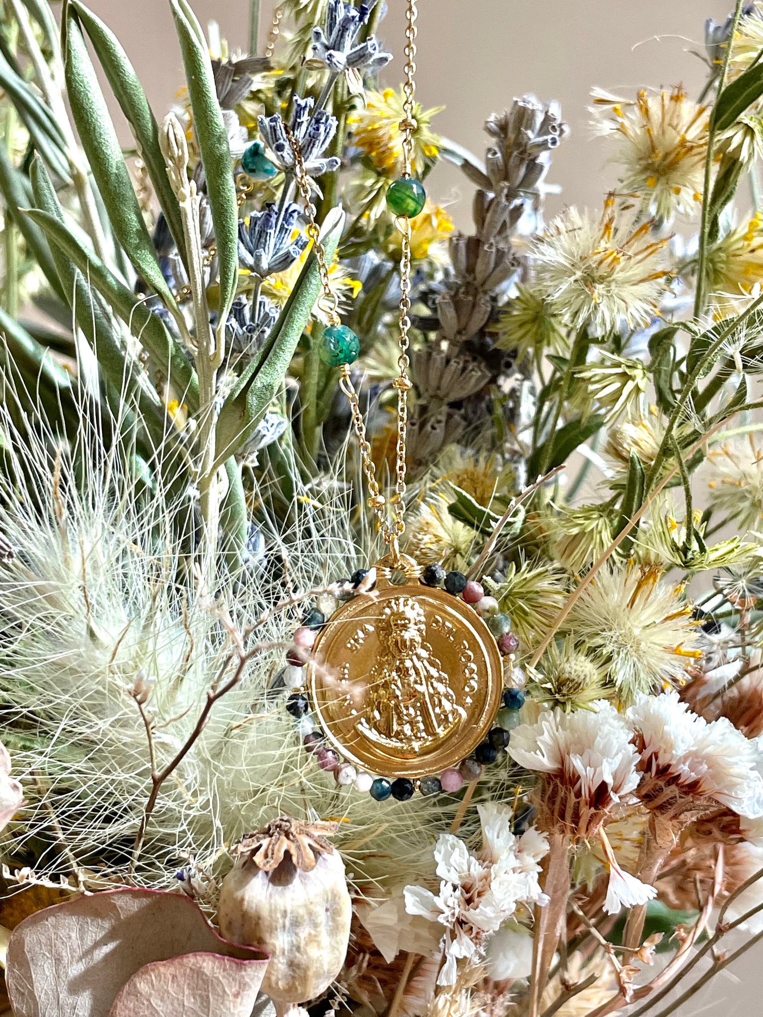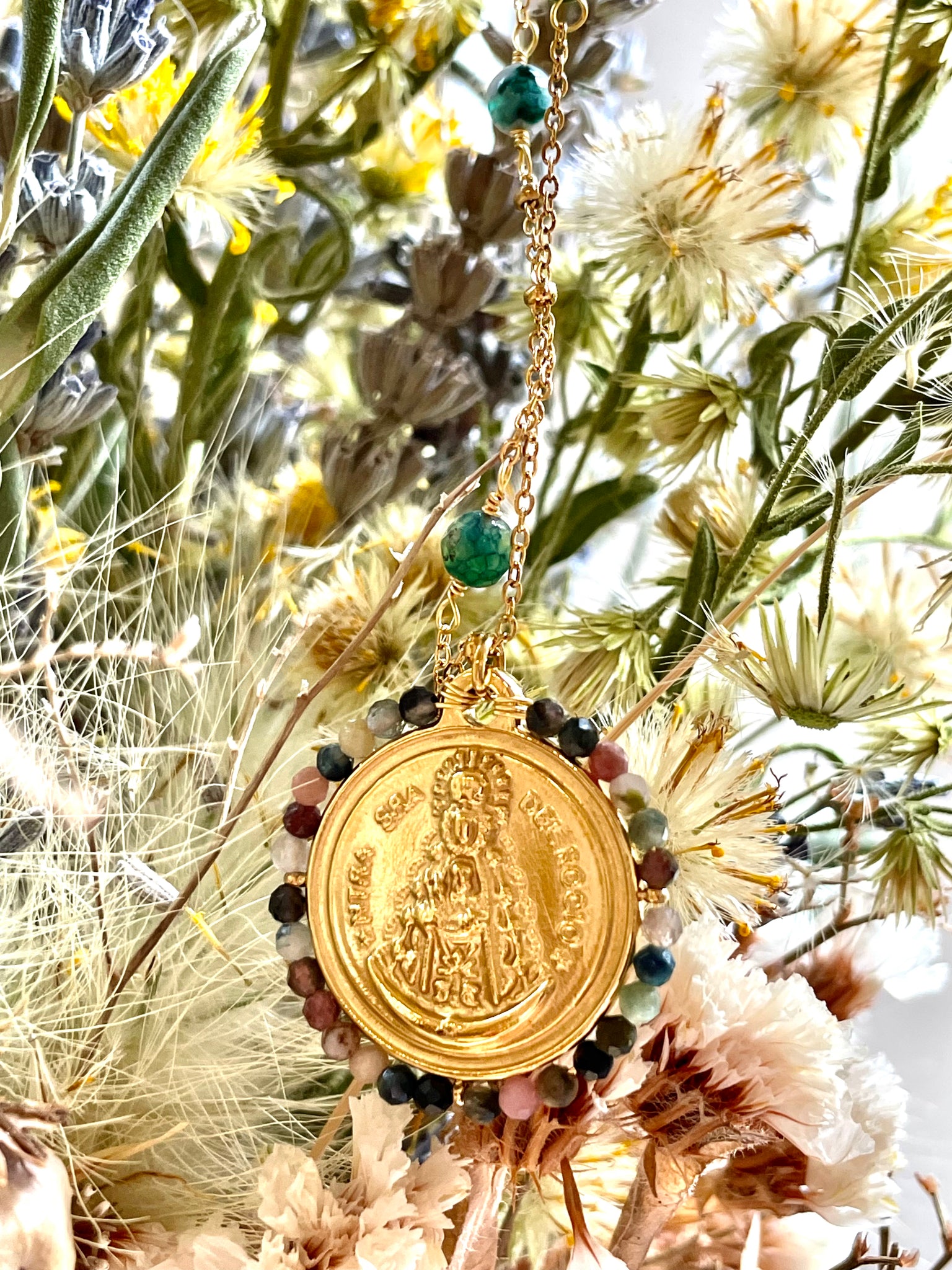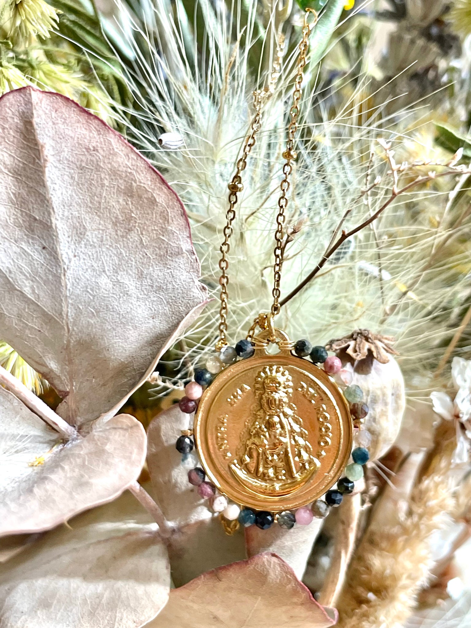 Medalla de la Virgen del Rocío con 22mm de diámetro, y ribeteada de turmalinas.