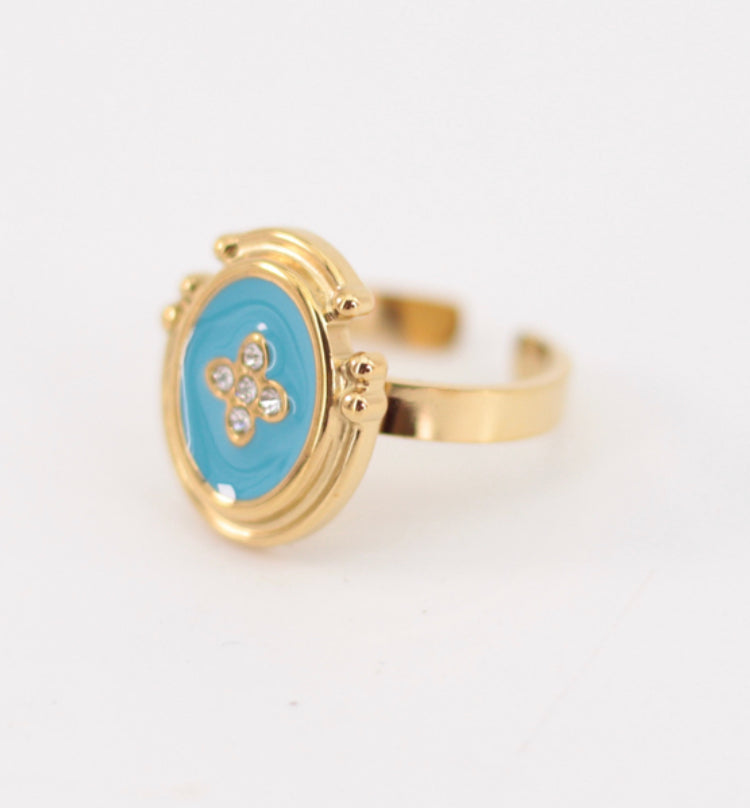 Anillo en acero inoxidable tipo sello con trébol de la buena suerte. Esmalte en color turquesa. Disponible también en naranja.