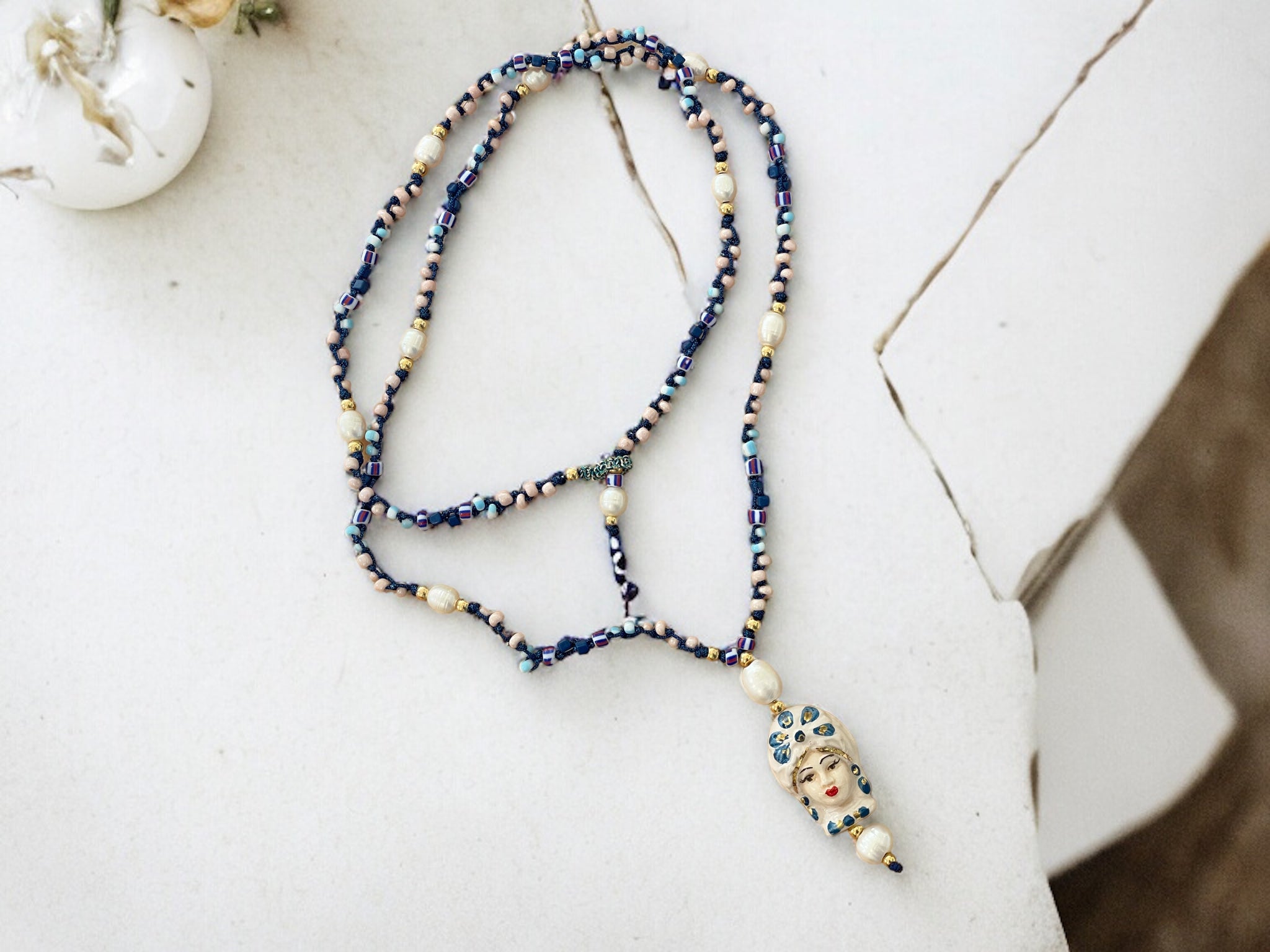 Realizado con hilo de seda y nylon, rocalla, cuentas en acero dorado, perlas de río y Agatas.