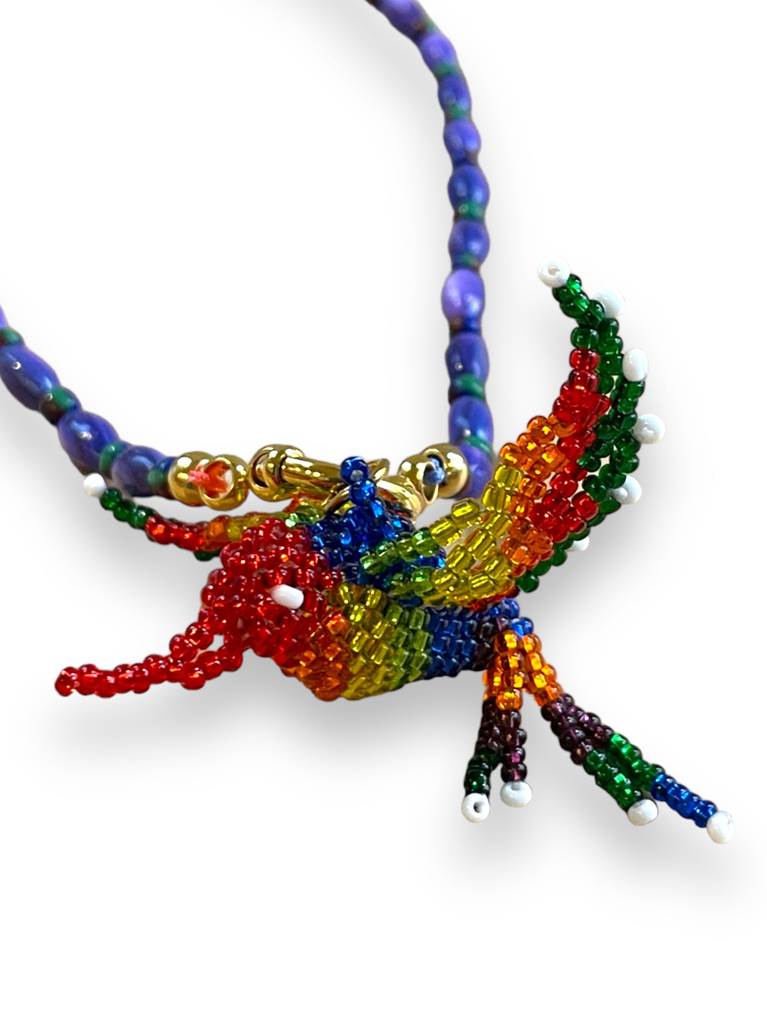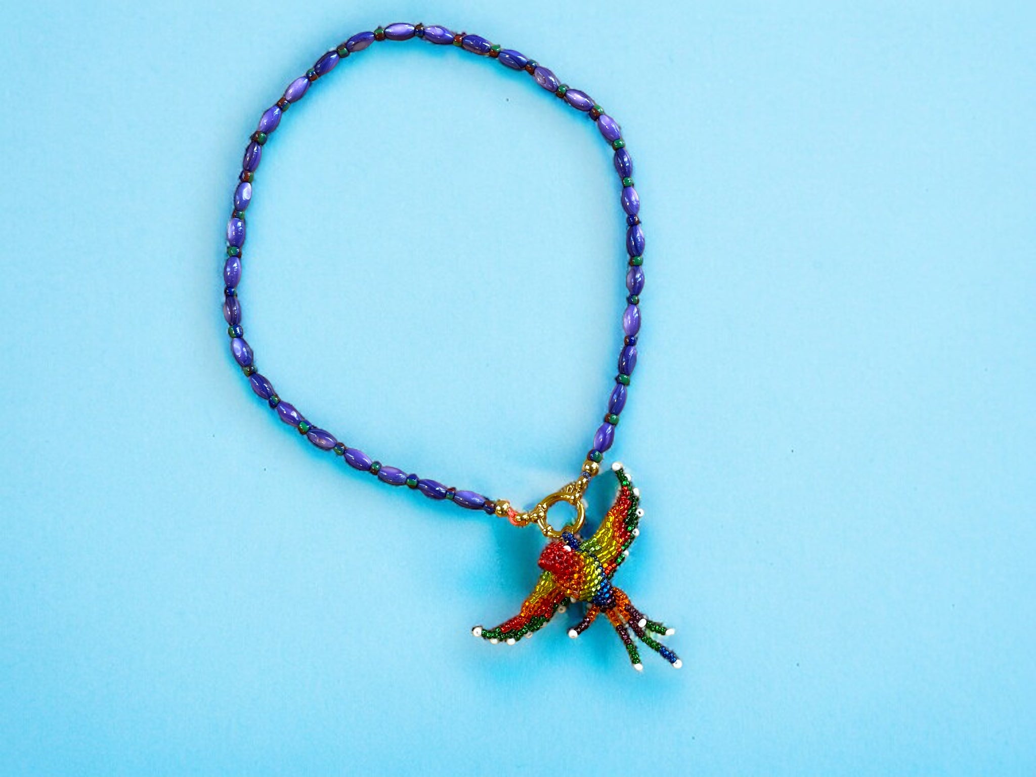 Colgante en forma de colibri realizado en rocalla.