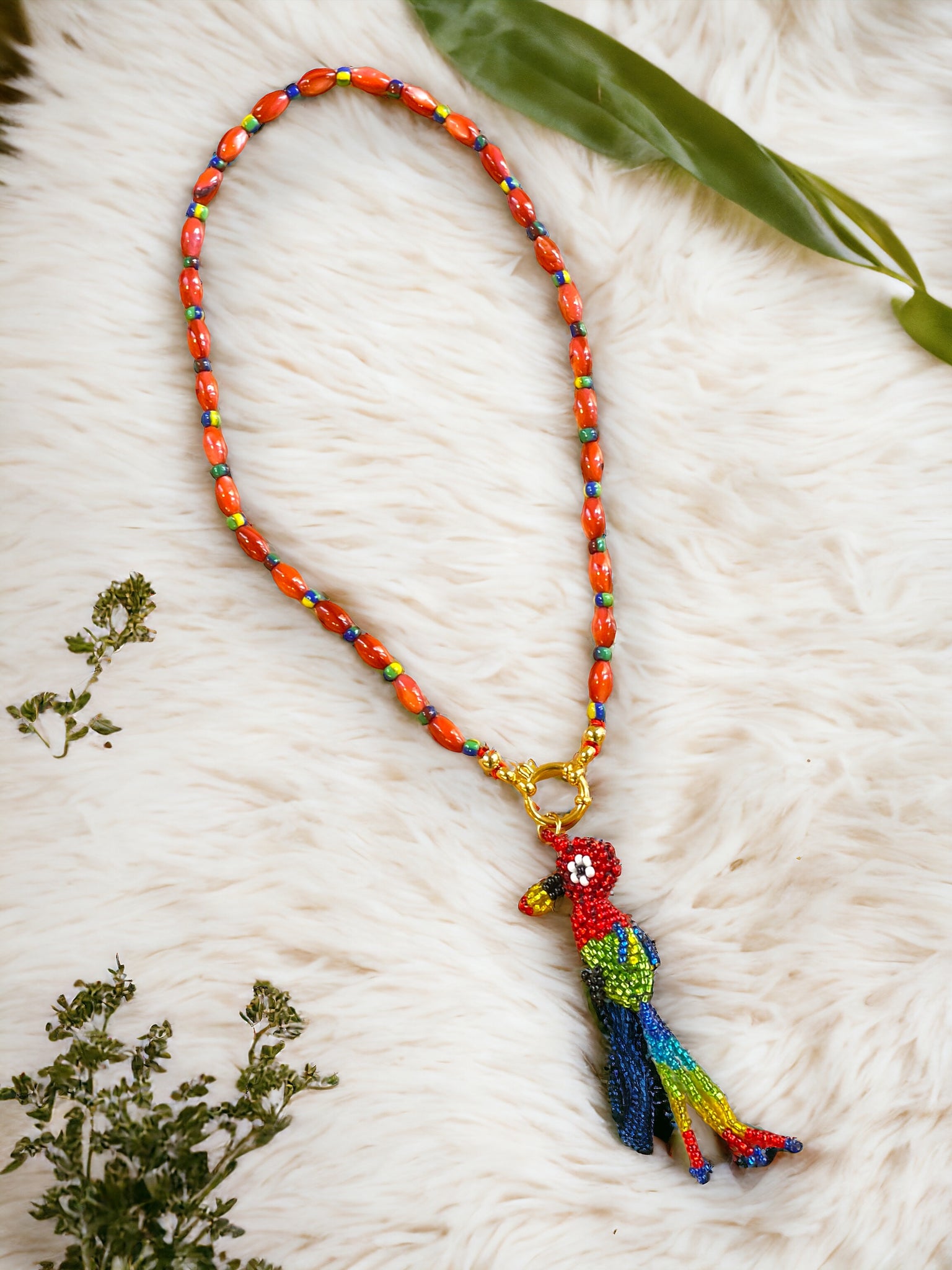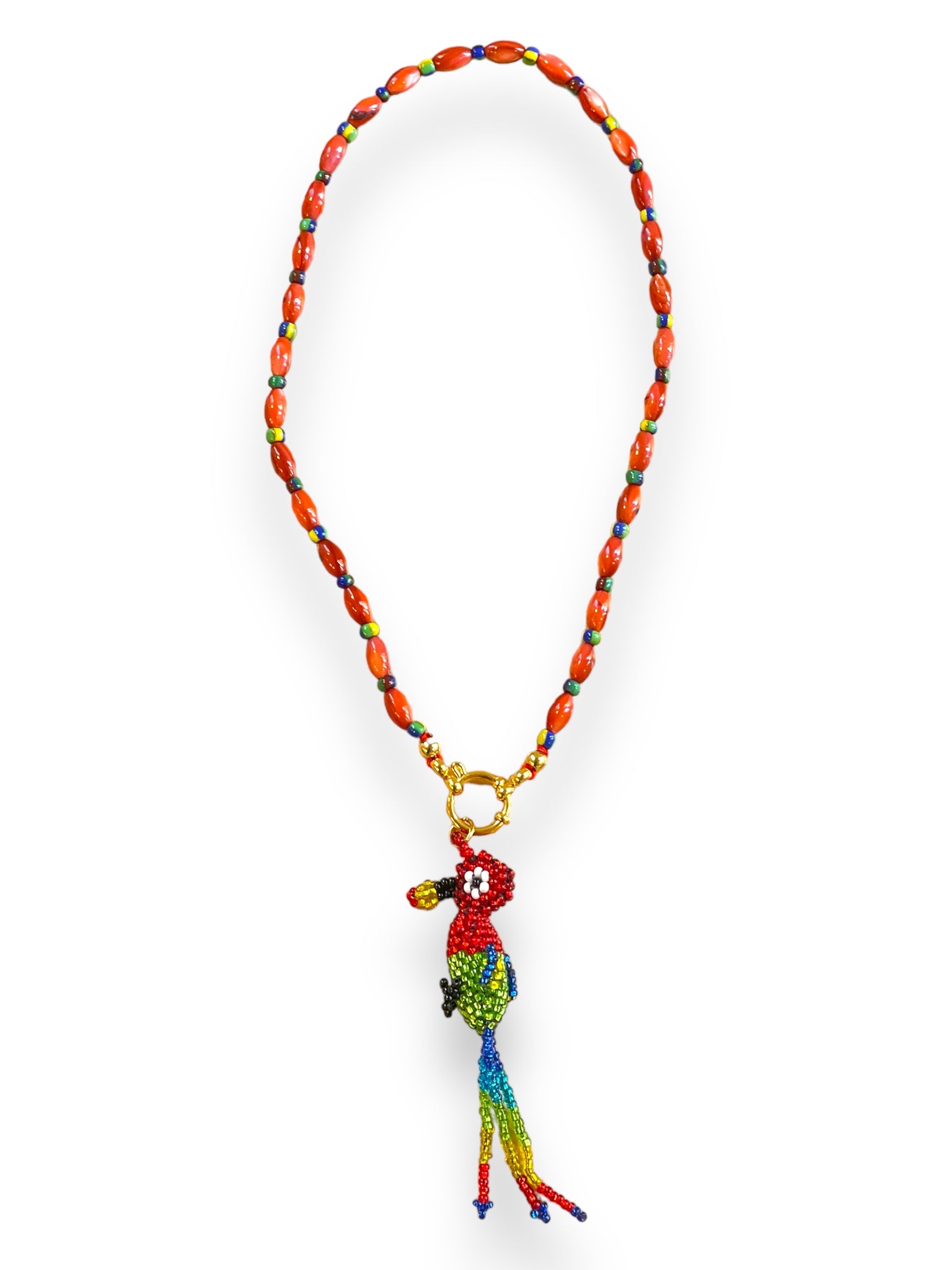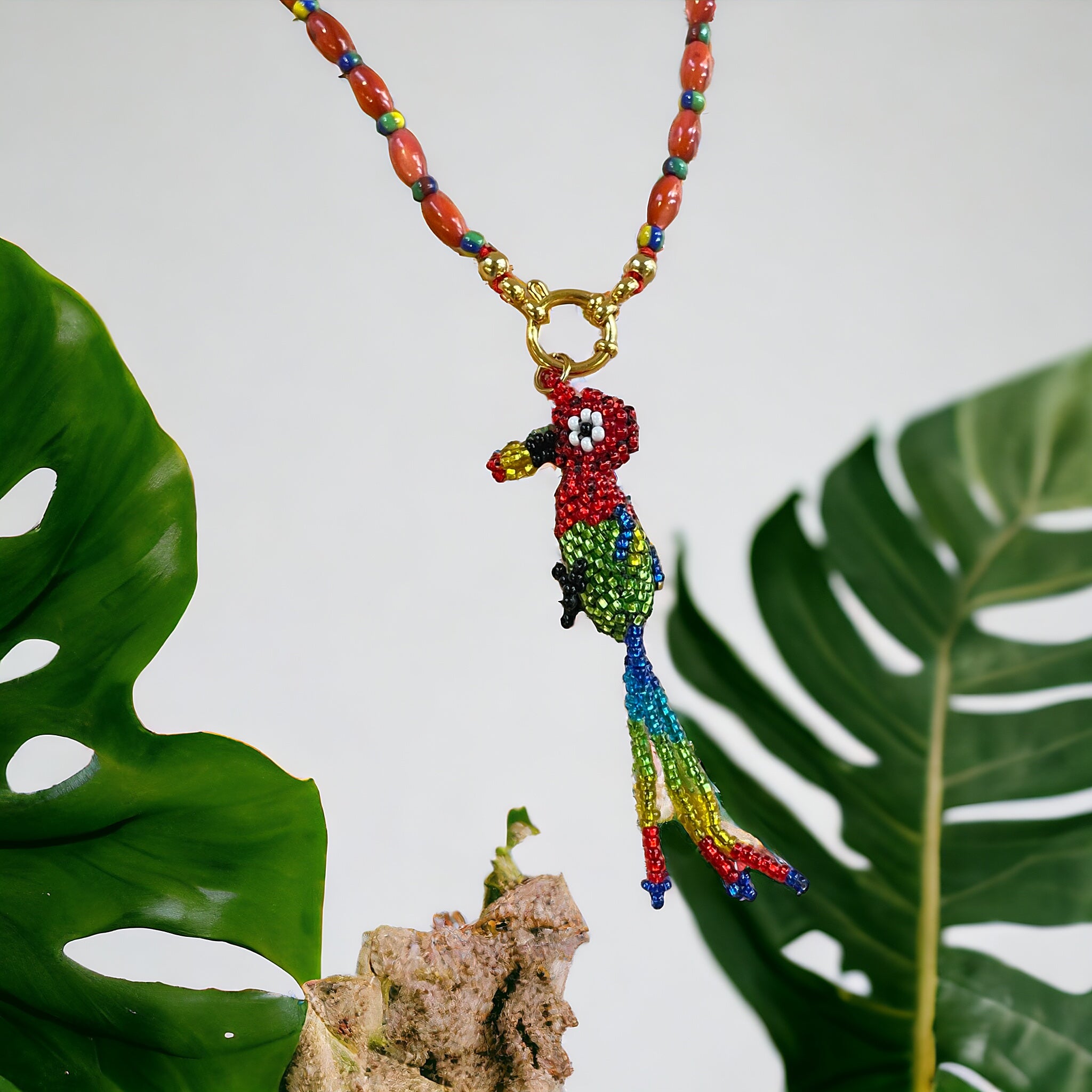 Colgante en forma de loro realizado en rocalla.
