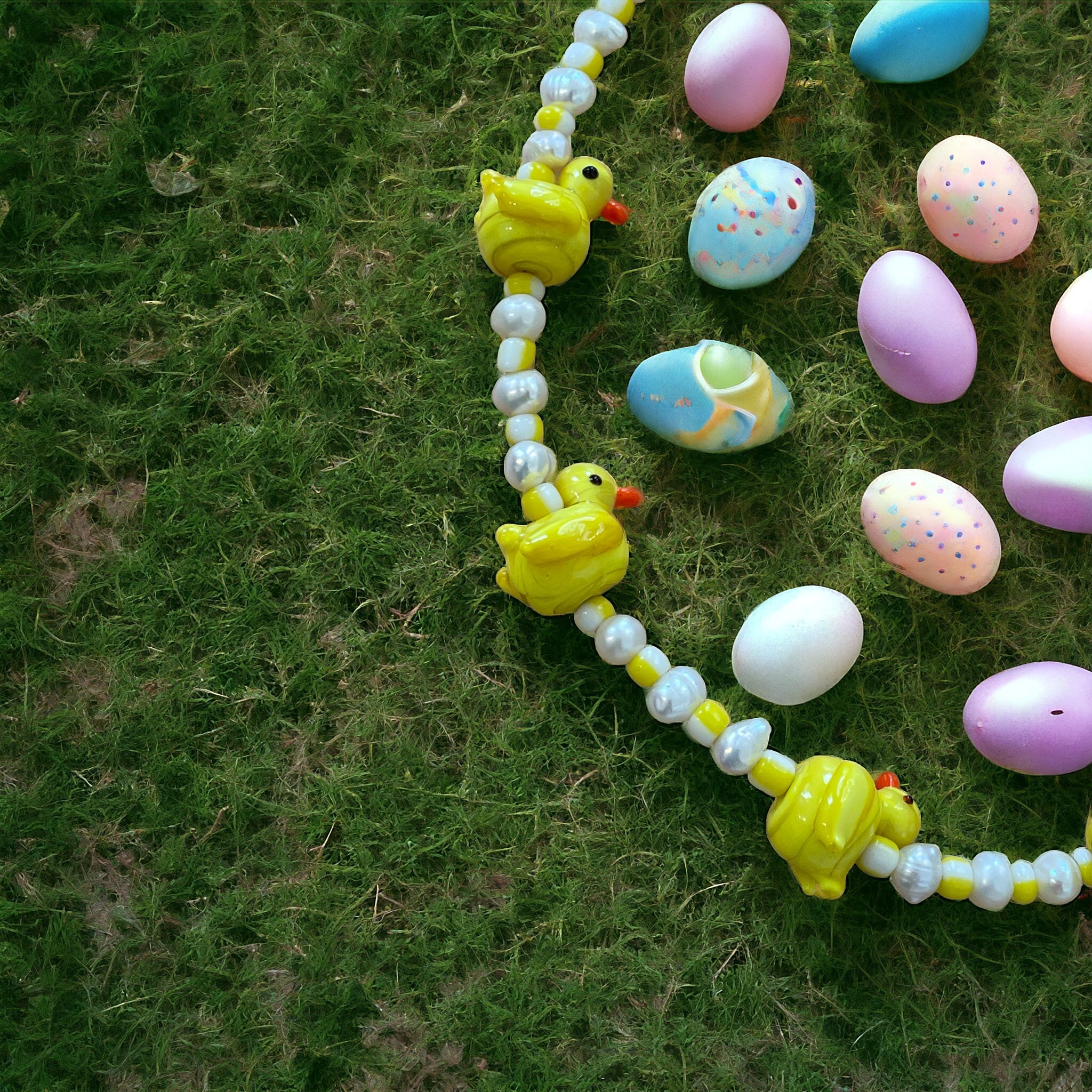 Gargantilla de perlas de río, abalorios y cuentas de cristal de mirando en forma de patitos.