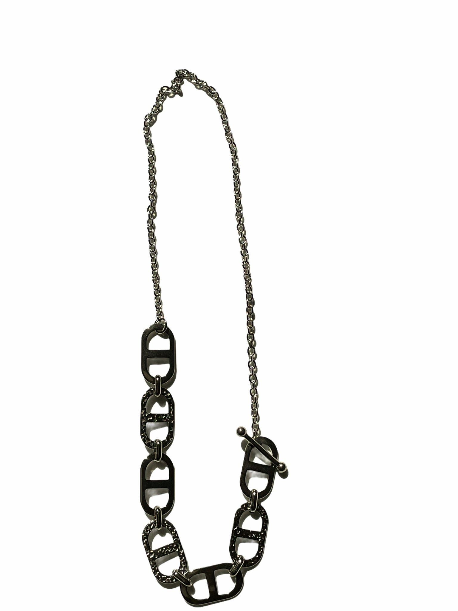 Mitad cadena, mitad eslabones tipo chapas de latas. Cierre en T.