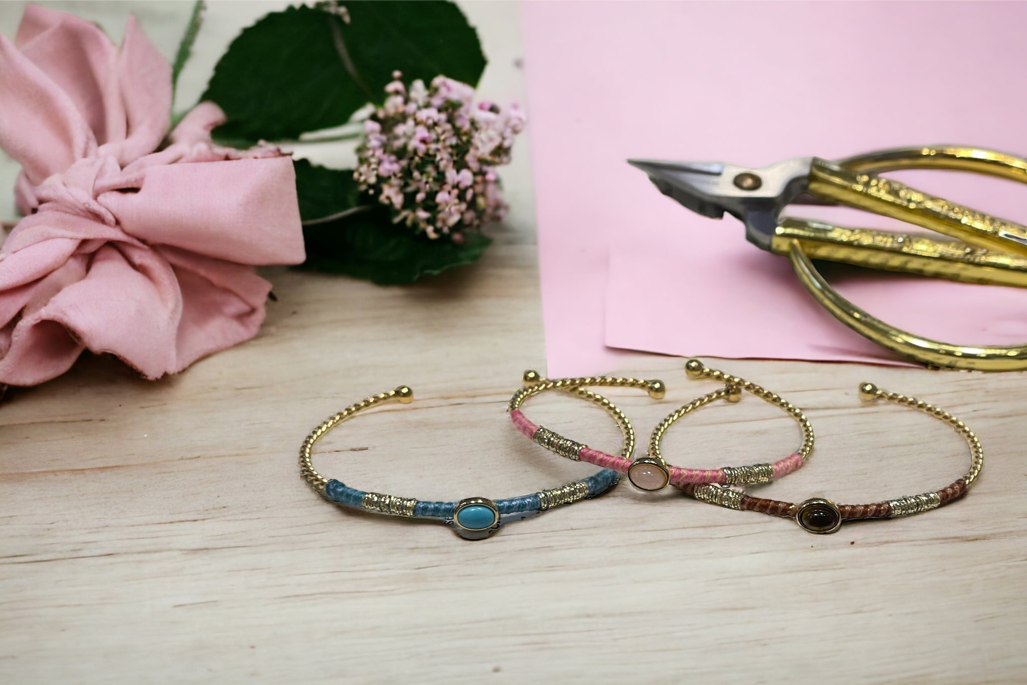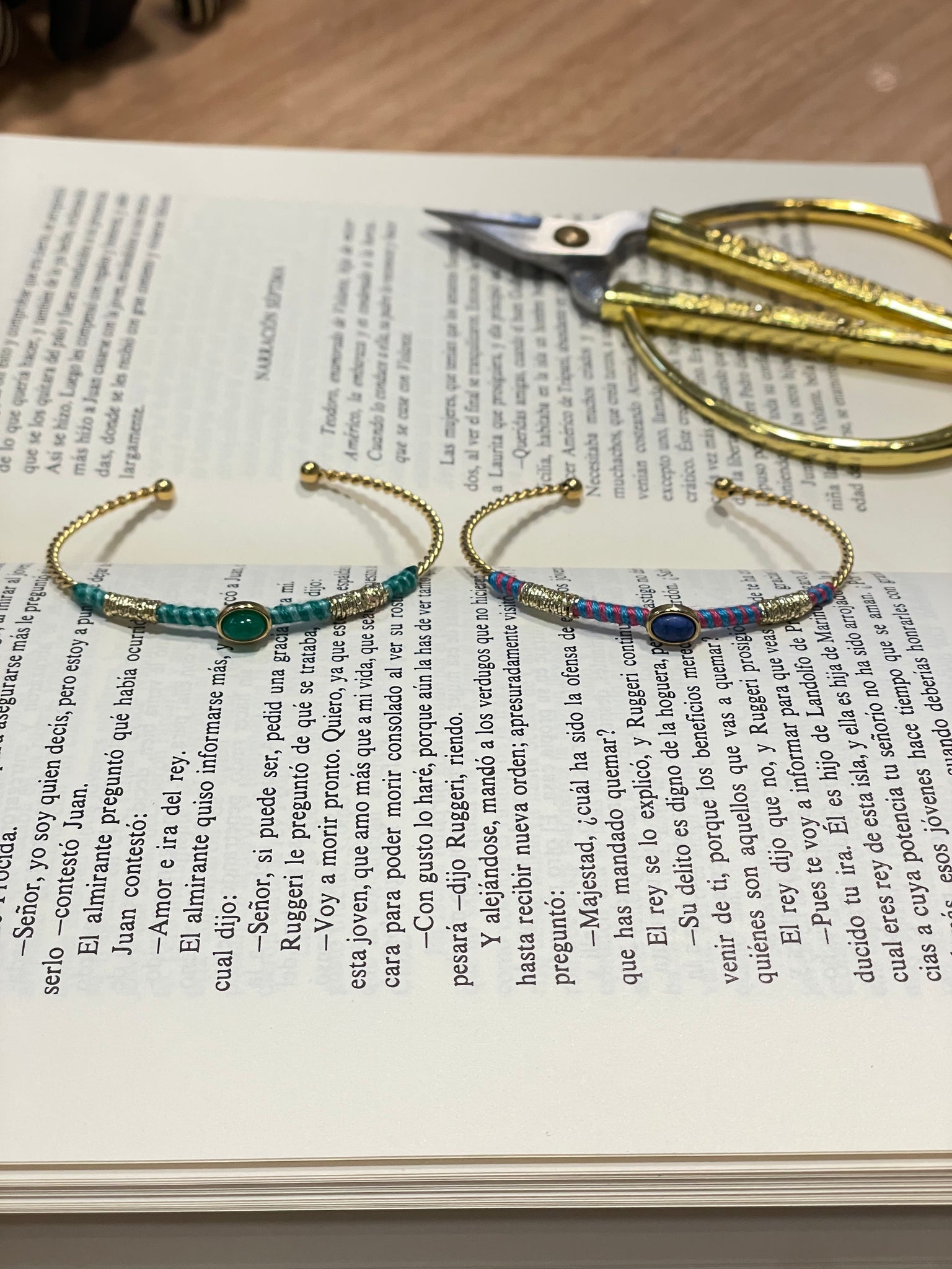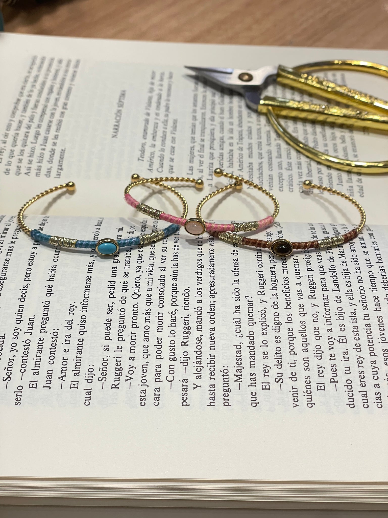 Brazalete en acero inoxidable dorado con hilo de seda de color y seda metalizada. Parte central con piedra natural.