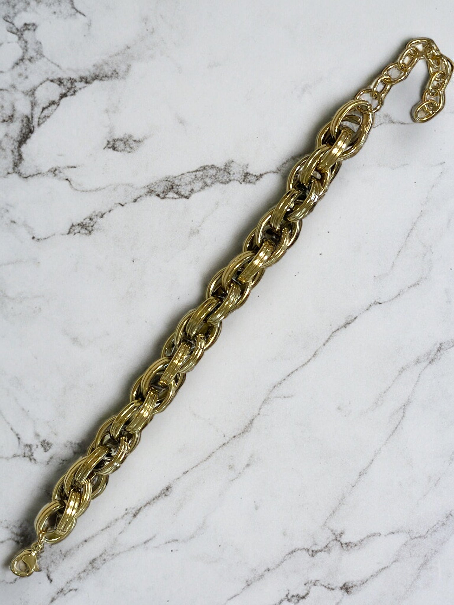 Pulsera en acero inoxidable dorado. Cierre con mosquetón y cadena reguladora.