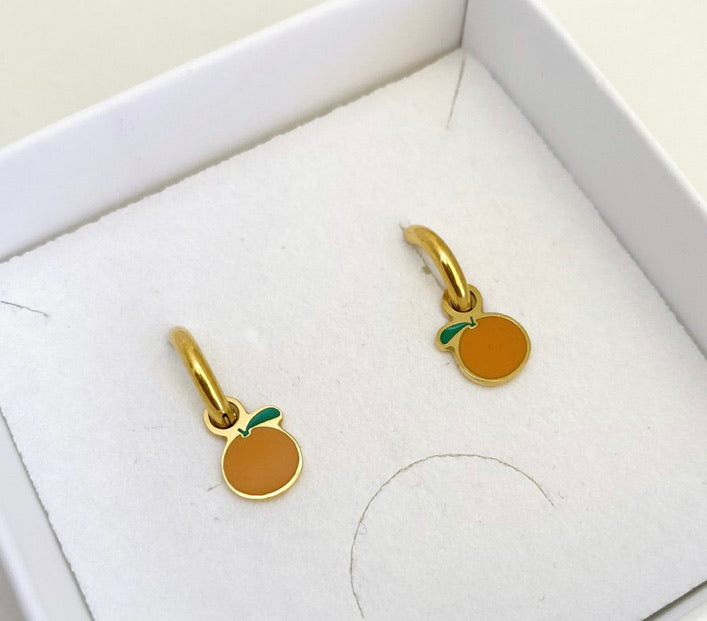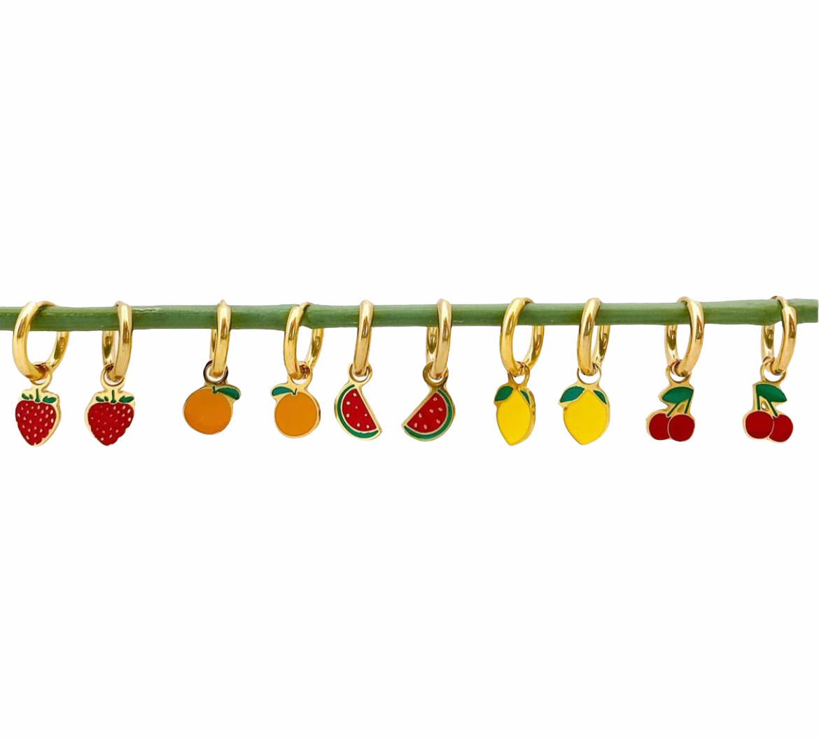 Colgantes esmaltados en forma de frutas.