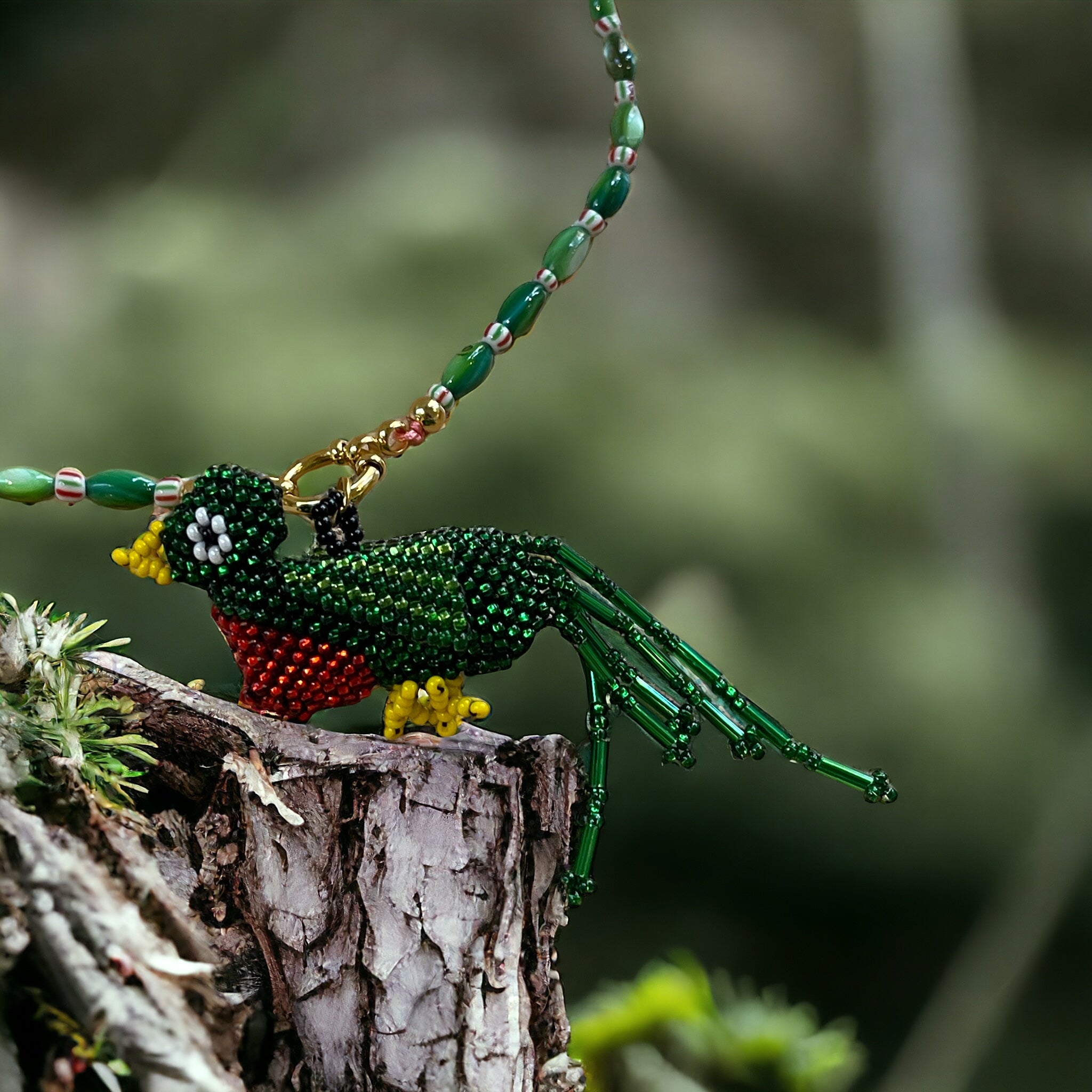 Colgante en forma de pájaro verde realizado en rocalla.