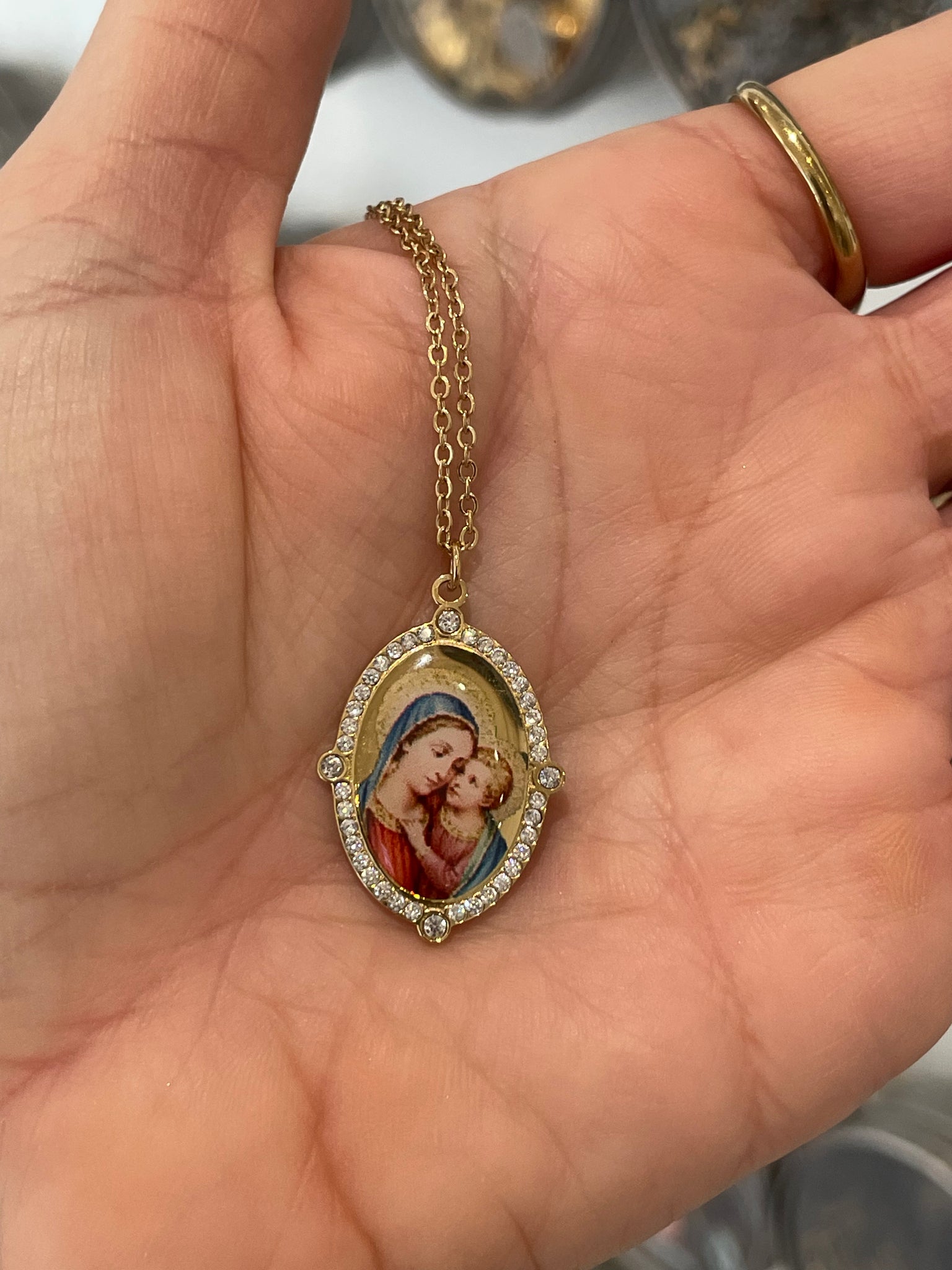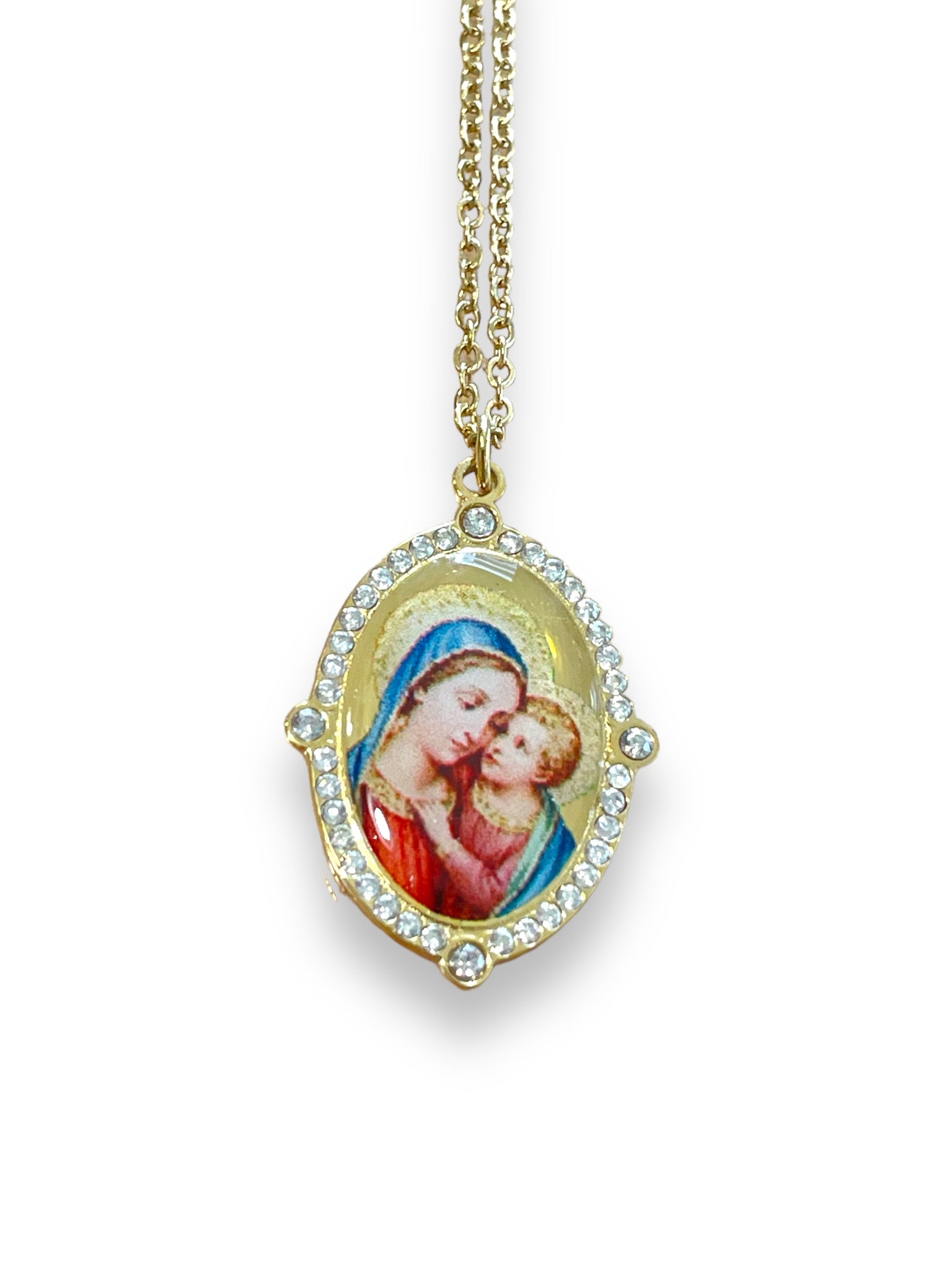 Medalla ribeteada con circonitas blancas. Imagen a color con la Virgen María y el Niño.